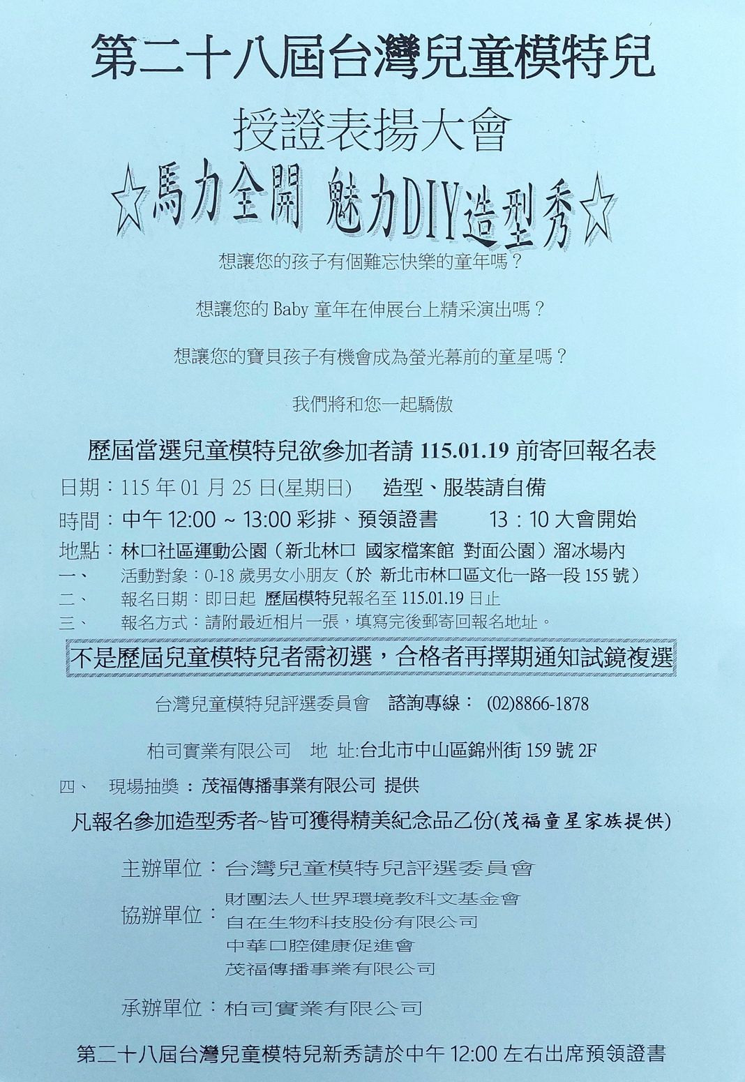 公告 第二十八屆台灣兒童模特兒 115/1/25 授證表揚大會 暨 ☆馬力全開 魅力DIY造型秀☆